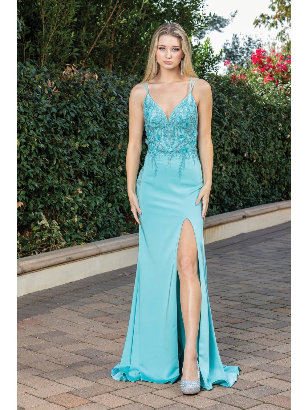CON PIERNA AFUERA CON TIRAS AJUSTABLES Y DETALLES DE ENCAJES EN EL TORSO Y TRANSPARENCIA A LOS LADOS COLOR ACGUA
